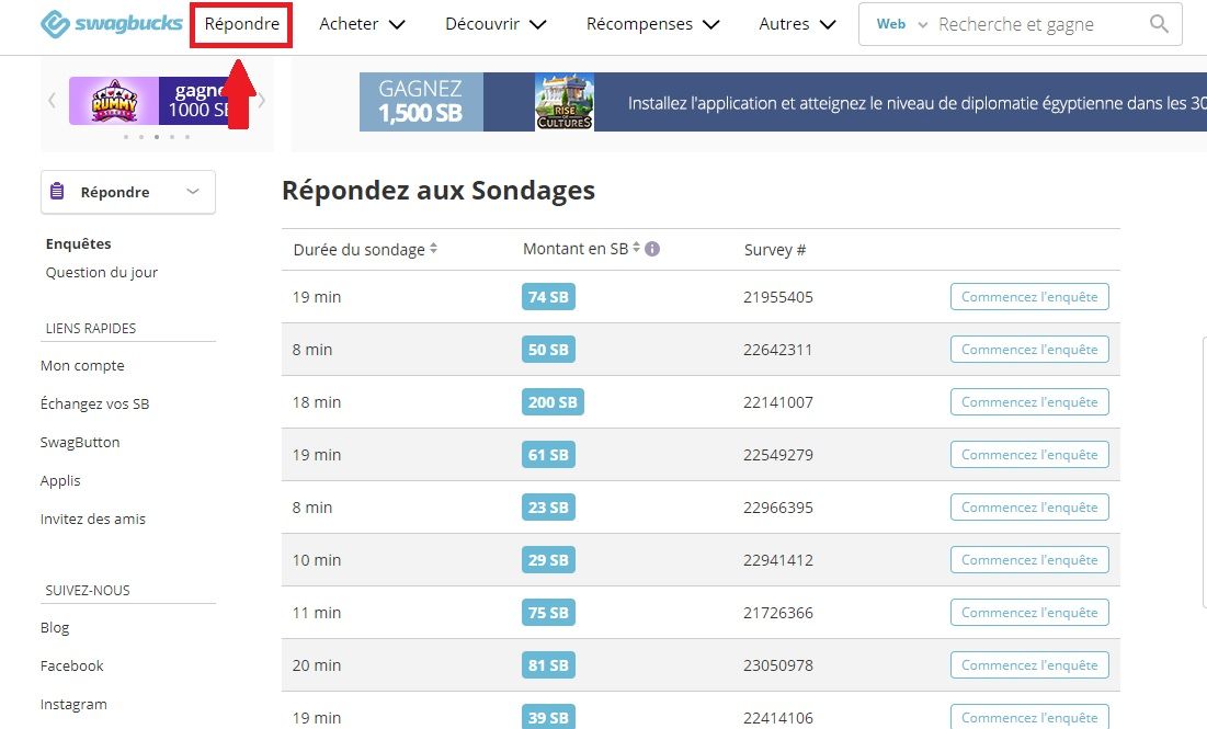 La principale raison pour laquelle je rédige un article test et avis au sujet de Swagbucks, c’est le fait que ce site propose de nombreux sondages rémunérés. C’est d’ailleurs l’une des fonctionnalités que la plateforme met le plus en avant.