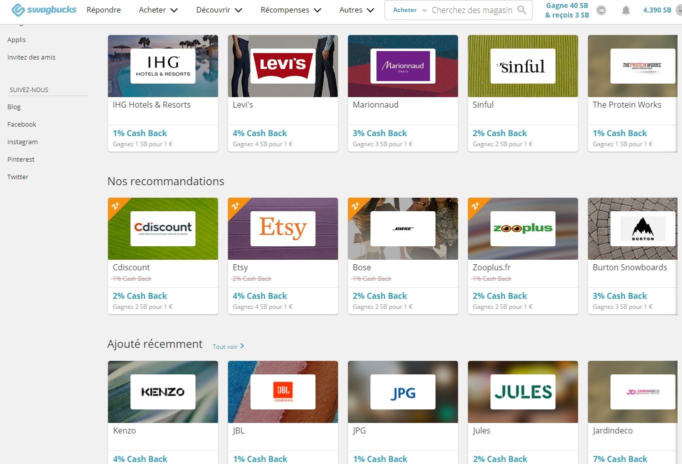 Autre solution pour augmenter sa cagnotte de points, les offres de Cashback. Le cashback est une solution qui permet d’épargner une partie de nos dépenses lorsque l’on réalise un achat en ligne sur un site marchand partenaire.
