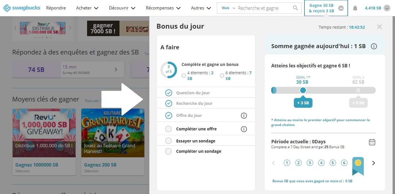 Il y a également des objectifs à atteindre. Par exemple, si vous gagnez seulement 30 SB sur la journée, et bien Swagbucks vous accordera un bonus supplémentaire. Ainsi qu’à chaque palier franchi. Donc, plus on gagne de SB… plus on gagne de SB.