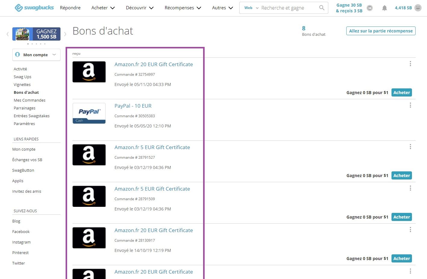 Une fois que l’on a cumulé suffisamment de SB, on peut les échanger contre de l’argent ou des cartes cadeaux.